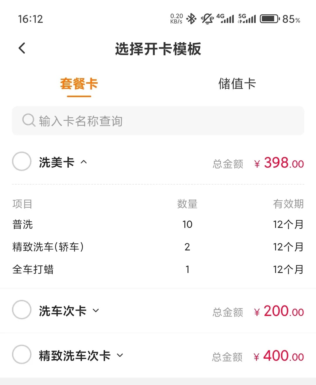 Another type is the car wash package card: it covers car wash sub cards and package activities, etc.