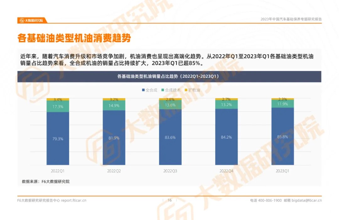 ▍In recent years, with the upgrading of automobile consumption and intensified market competition, oil consumption has also shown a trend towards high-end. From Q1 2022 to Q1 2023, the sales proportion of various base oil types of engine oil shows a continuous expansion, with the sales proportion of fully synthetic engine oil exceeding 85% in Q1 2023.