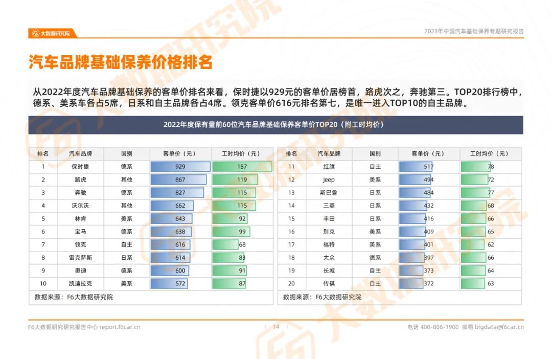 ▍According to the ranking of basic maintenance unit prices for car brands in 2022, Porsche ranks first with a unit price of 929 yuan, followed by Land Rover and Mercedes Benz in third place. In the TOP20 ranking, German and American cars each occupy 5 seats, while Japanese and domestic brands each occupy 4 seats. Lynk&Co ranks seventh with a unit price of 616 yuan and is the only domestic brand to enter the TOP10.