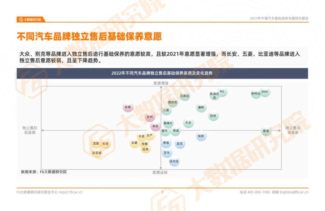 ▍Brands such as Volkswagen and Buick have a higher willingness to enter independent after-sales service for basic maintenance, and their willingness has significantly increased compared to 2021. However, brands such as Changan, Wuling, and BYD have a weaker willingness to enter independent after-sales service and are showing a downward trend.