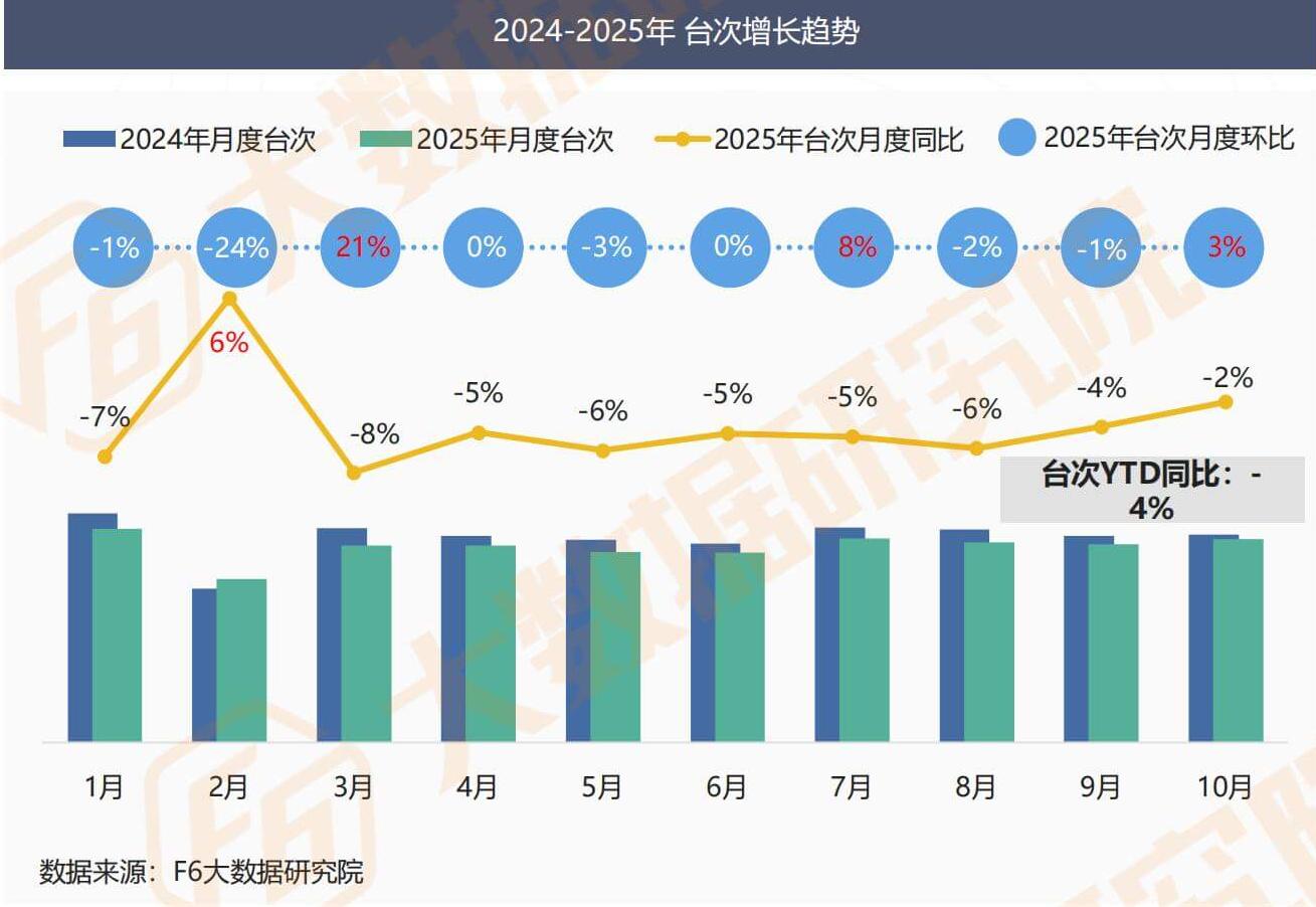 Excluding the Spring Festival factor, all platform numbers in the market will decline year-on-year after 2025, but the current monthly year-on-year decline has significantly narrowed. As of October, the cumulative YTD of platform numbers has decreased by 4% year-on-year.