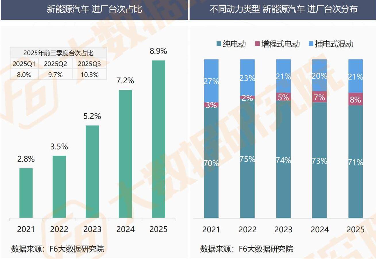 The number of new energy vehicles entering the factory through independent after-sales channels continues to grow rapidly. In the third quarter of 2025, it has exceeded 10%, accounting for 8.9% of the total year, while the proportion structure of the three different types of power entering the factory tends to stabilize.