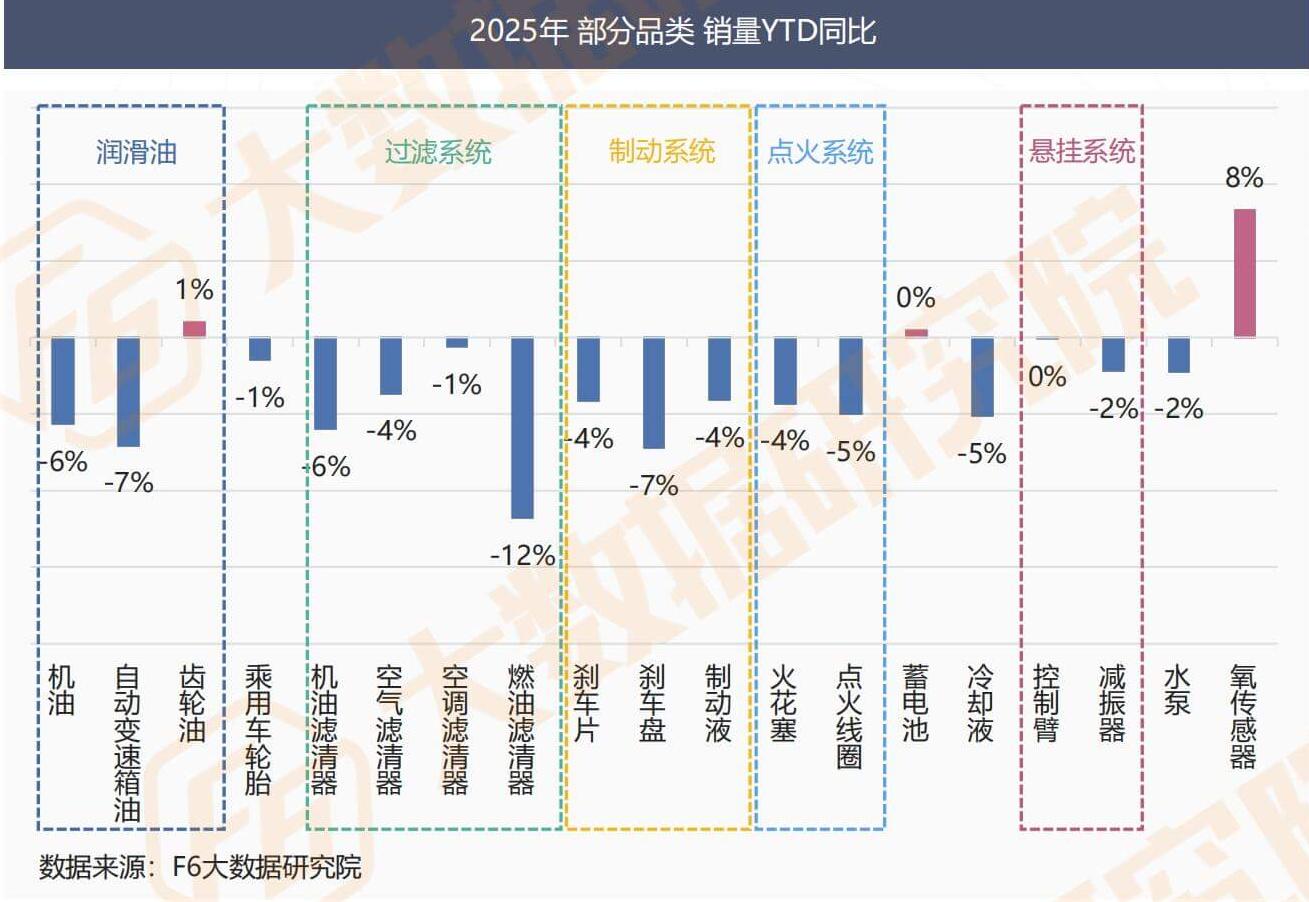 In 2025, the sales of most categories in the aftermarket will decline year-on-year, while the sales of gear oil, batteries, and oxygen sensors will increase year-on-year, and the sales of control arms will remain the same as the same period last year.